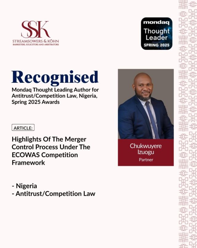 We congratulate our competition law partner, Chukwuyere Izuogu, on being recognised by Mondaq, an international legal publication, as a thought leader in competition and antitrust law in Nigeria for his insightful article, “Highlights of the Merger Control Process Under the ECOWAS Competition Framework.”